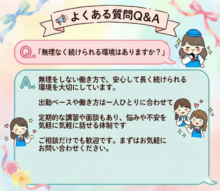 A 無理をしない働き方で、安心して長く続けられる環境を大切にしています。出勤ペースや働き方は一人ひとりに合わせて相談OK。定期的な講習や面談もあり、悩みや不安を気軽に話せる体制です。